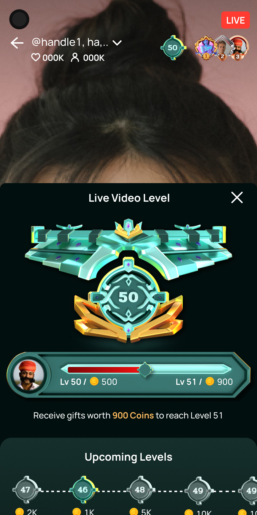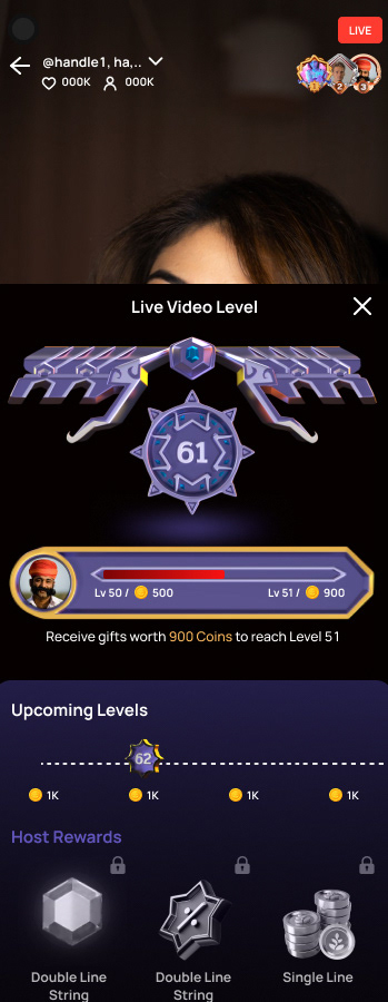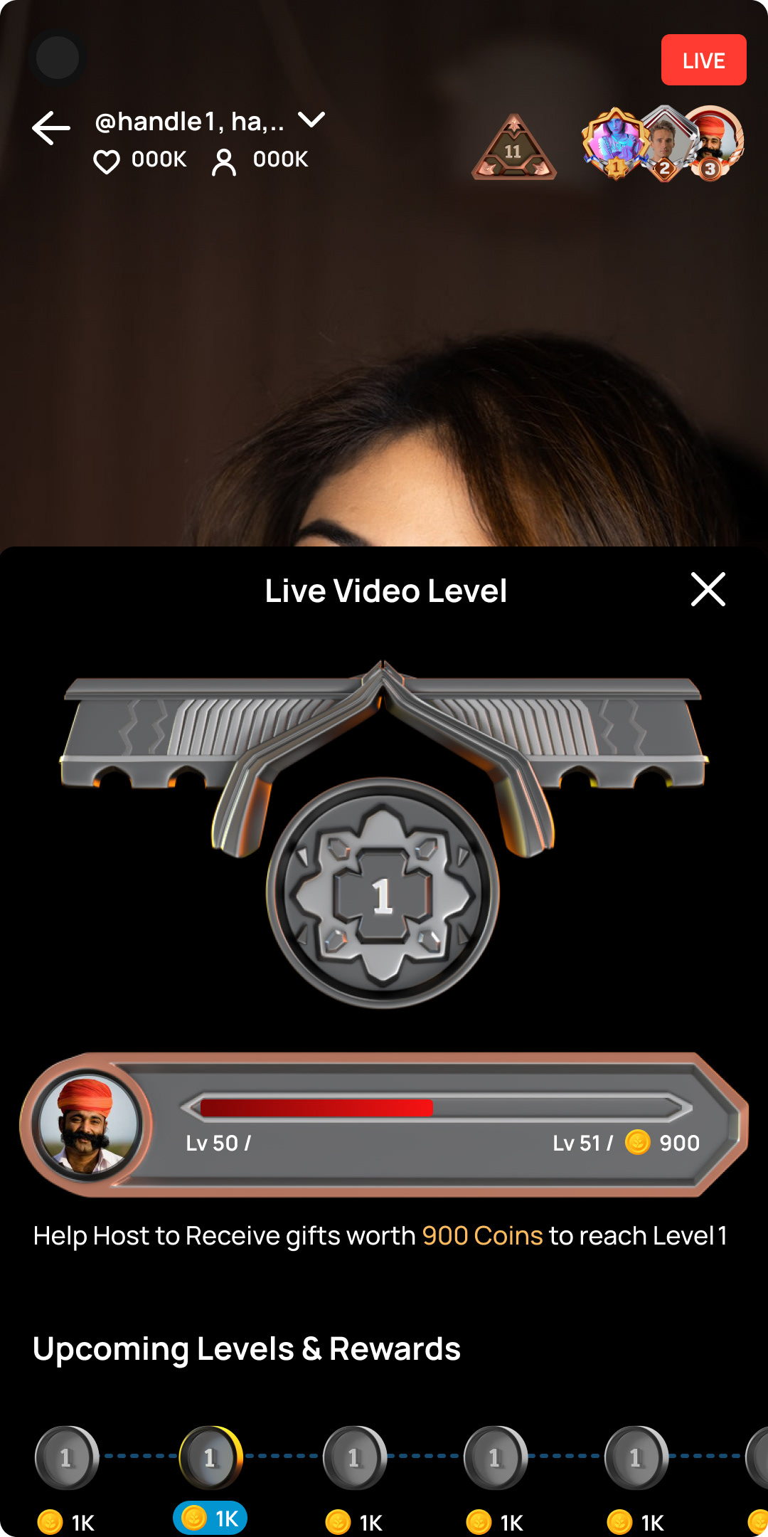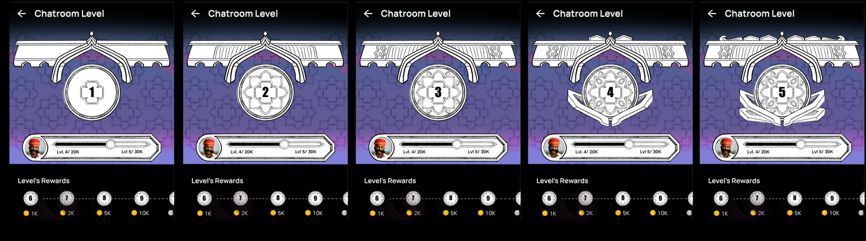 During my time as Lead illustrator at Sharechat I undertook the Creator Levels project , working alongside our wonderful in-house 3D team. The project was intended to help gamify the creator experience on the Sharechat Live chatroom product. This feature enabled users to keep leveling up as they used the platform, incentivizing them to continue creating live content with aspirational badges, virtual coins and rewards