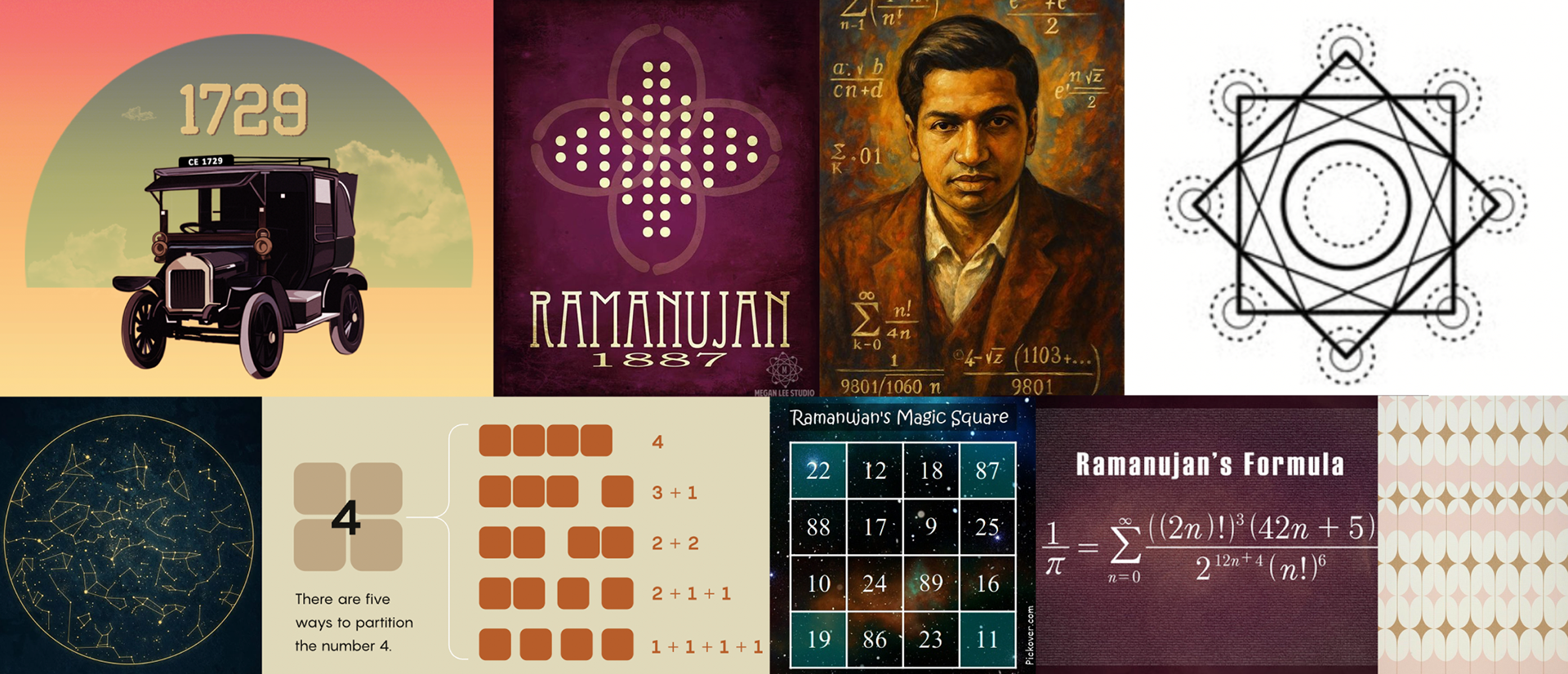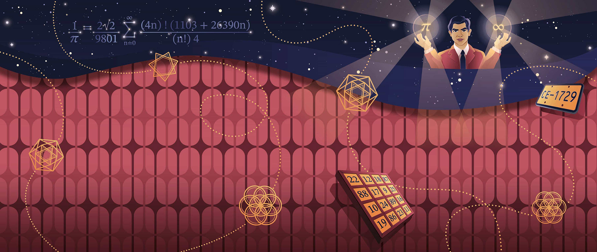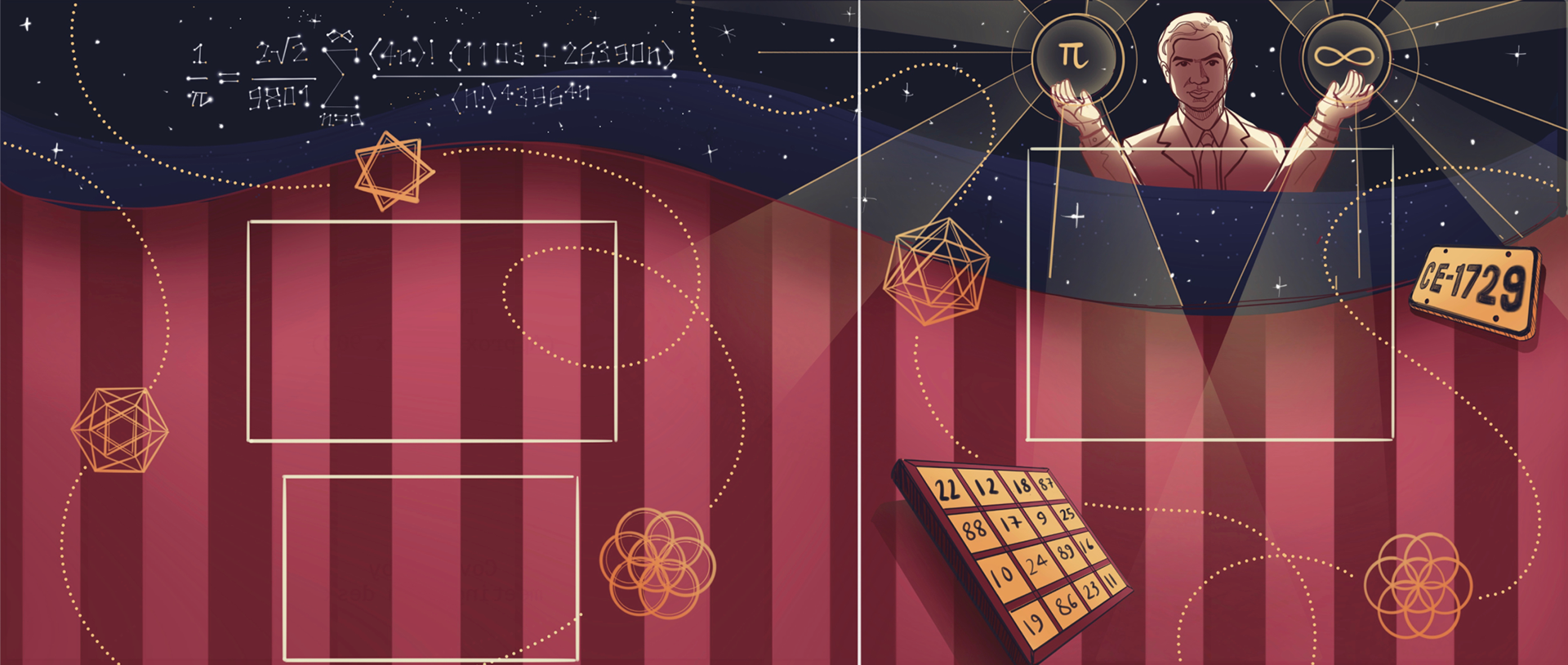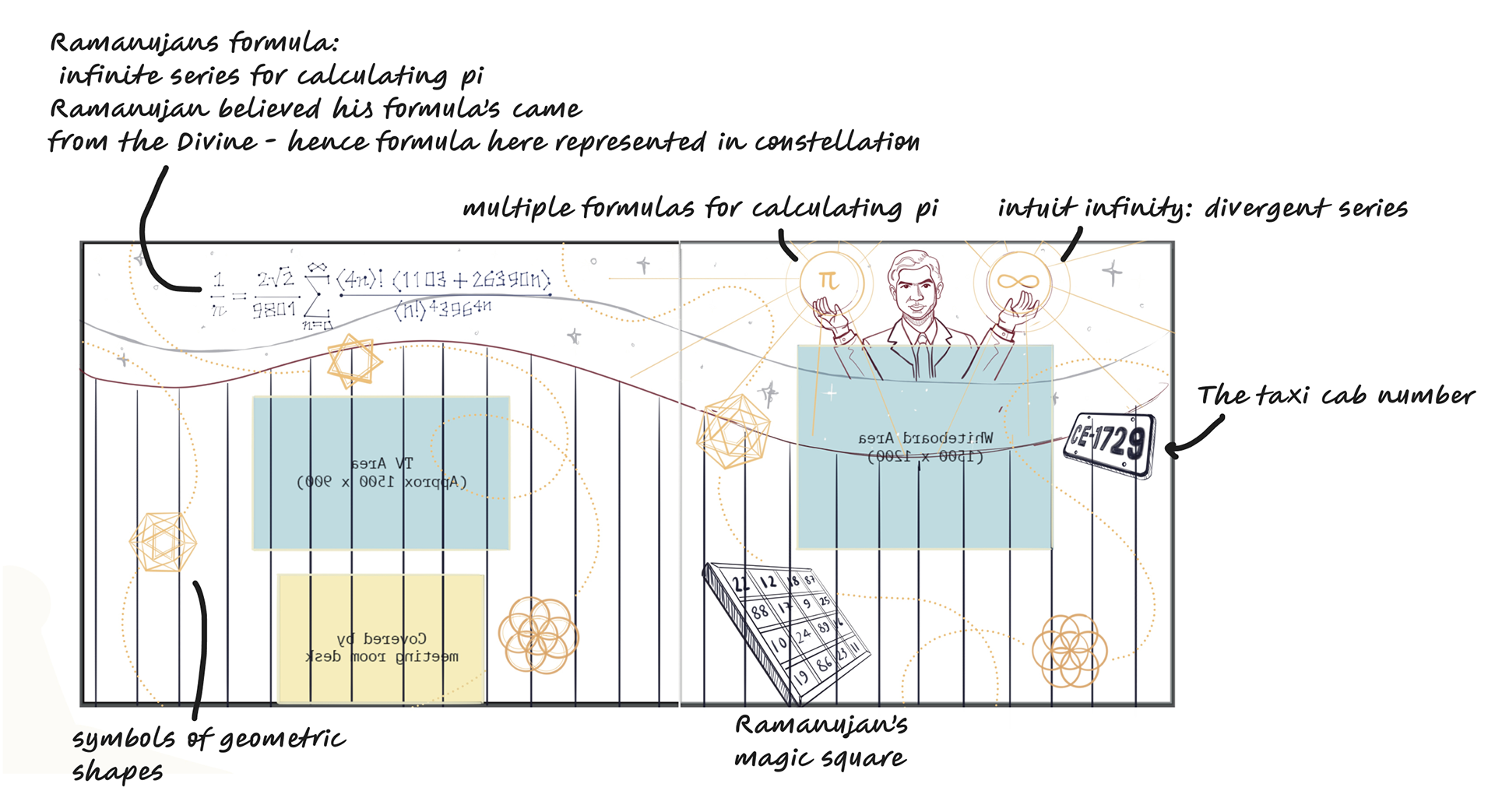 While the brief recommended each meeting room be dedicated and named after an accomplished scientist , my intention was to go as deep as I possibly could and avoid doing a simple portrait. To ensure the work was as representative of the scientist as possible, I dived into Ramanujan's life and times, his beliefs and his discoveries - picking out key visual metaphors such as his belief that his intuitive mathematical work was bestowed upon him by the divine. We see him here weilding divine formulas, symbols and geometry in a delicate balance within the cosmos.