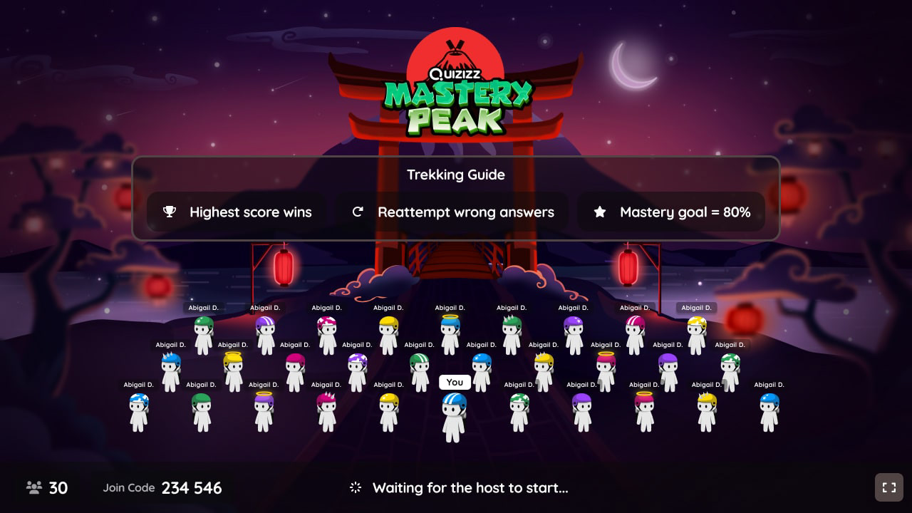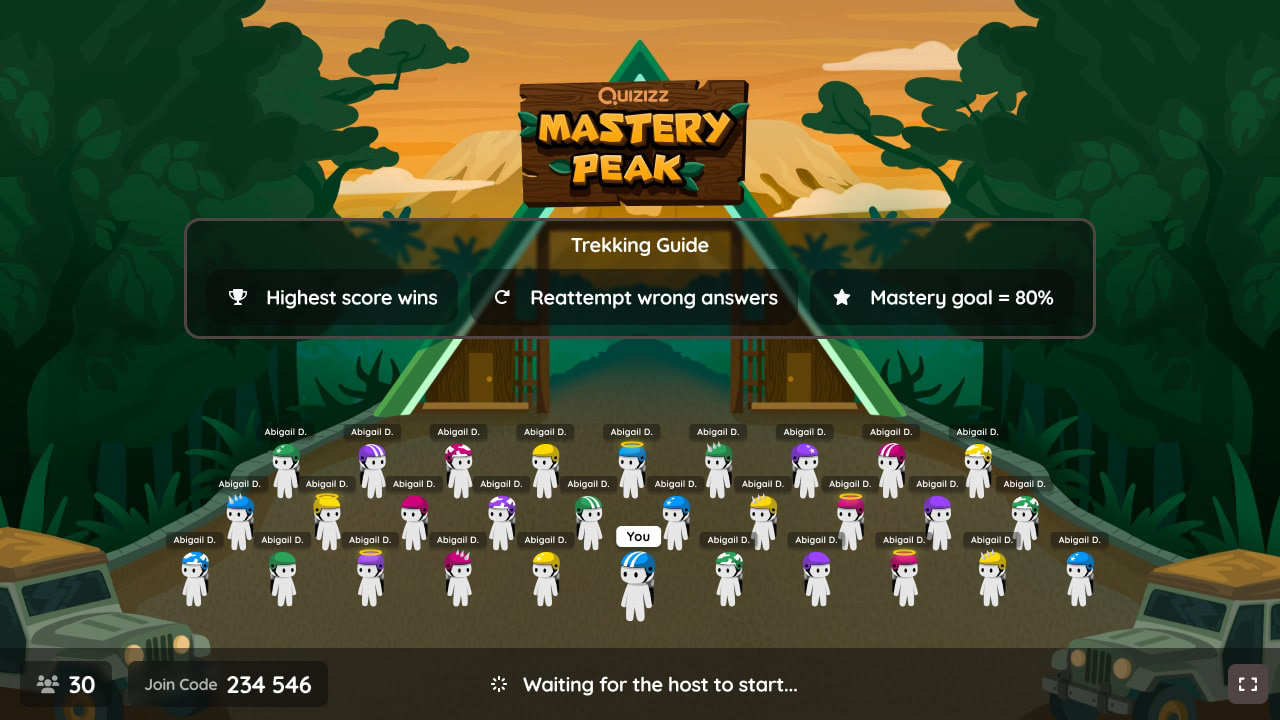 Mastery Peak is a quiz based game on Wayground (Formerly Quizizz) where students in a classroom participate to scale up a mountain as they answer questions set by the teacher. It gamifies the entire Q/A process of test-taking and introduces fun mini-games when students enter the 'Breakroom'. The teacher is allowed to set a 'Mastery' score - hence students can re-attempt answers until they attain a certain level of mastery in the quiz.