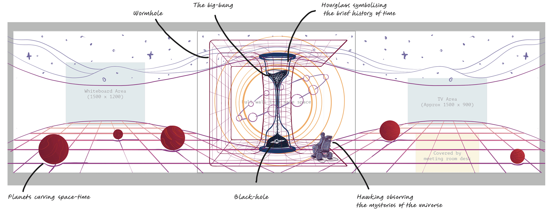 The concept behind the Hawking room stems entirely from his theories on the Big Bang, Blackholes, Wormholes as well as his book 'A brief history of time'. This was a 3 wall space with the central wall taking precendence. The flanking walls were reserved for TV and Whiteboard space, and hence had to flow with the piece but avoid incorporating any significant conceptual work.
