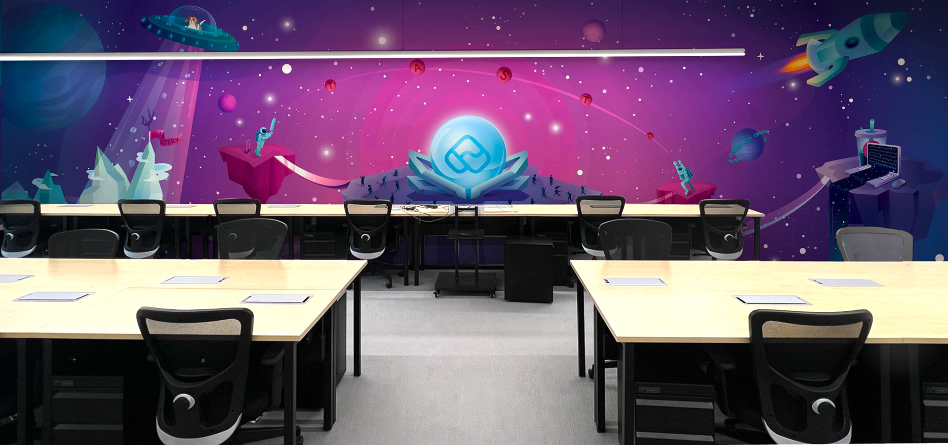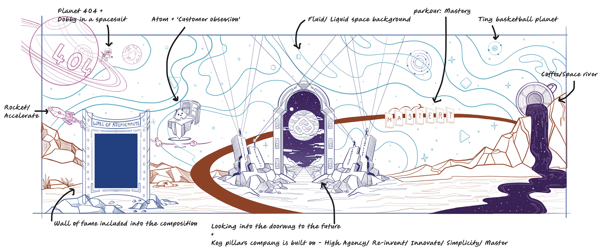 Both these artworks were intended to occupy one meter long walls in two seperate rooms - one inhabited by the Design, Product & Marketing teams - the other for the Dev, AI & Engineering co-hort. I really wanted to incorporate the company core values in a subtle but subliminal manner throughout both pieces. (Values are ATOMIC- Agency, Taste, Ownership, Mastery, Impatience, Customer Obsession) All six values can be found merged into the artwork if you look closely enough!